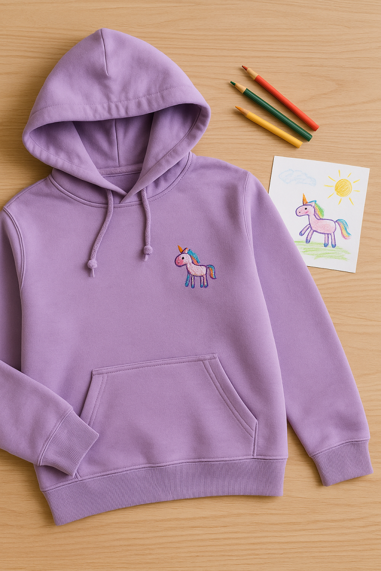 Bei uns könnt ihr die Zeichnungen eurer Kinder auf Kleidungsstücke & Accessoires drucken oder sticken lassen.